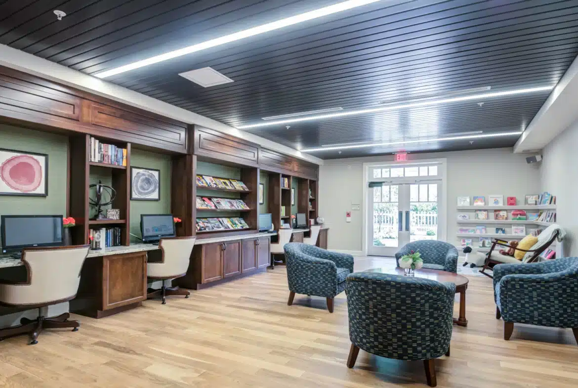 - Library: Our spacious and quiet on-site library is a peaceful haven for those who enjoy reading, meaningful connection, or space for reflection.