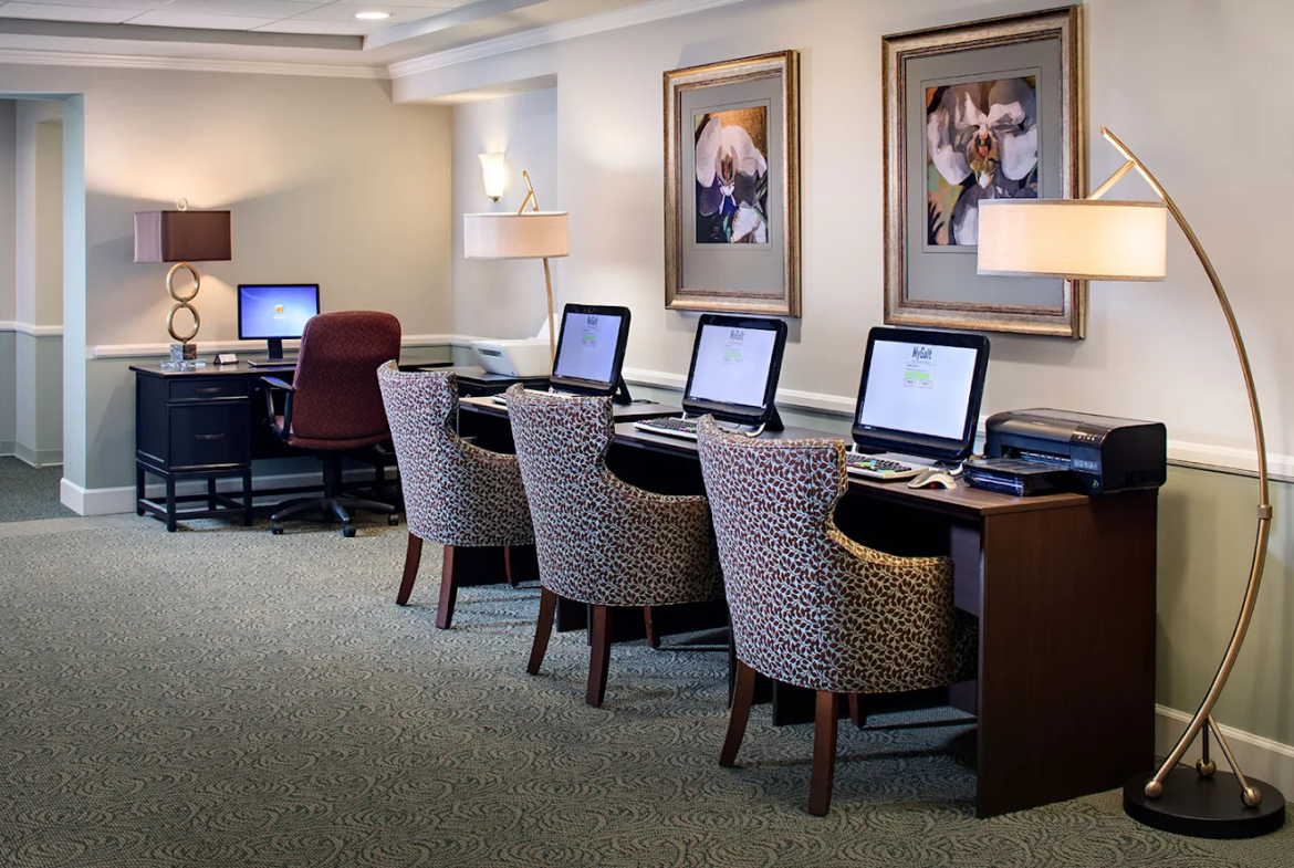 Explore our Sunnyvale senior living community and discover the abundance of amenities, including elegantly designed common areas for gatherings and a technology center to help you stay connected.