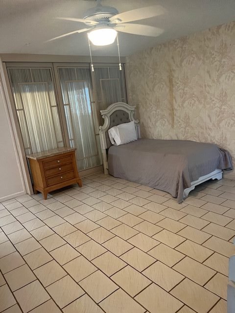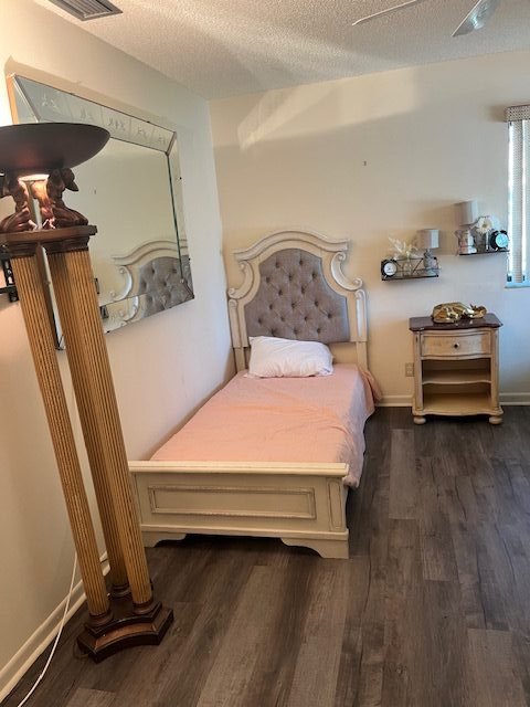 - Bedroom is furnished (bed, chair, closet, dresser, and a side table)