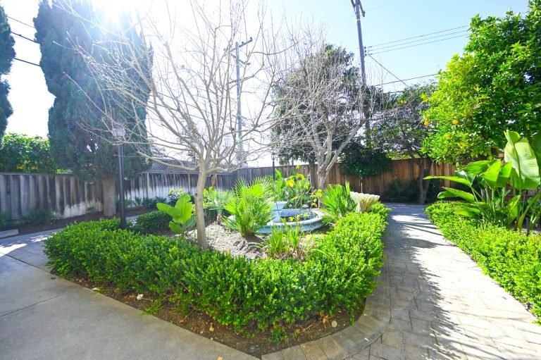 - Outdoor garden and walkway with a fountain, fruit trees and tranquil seating.
