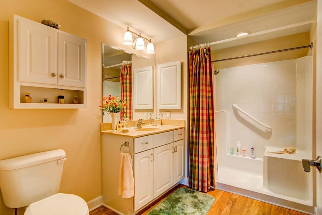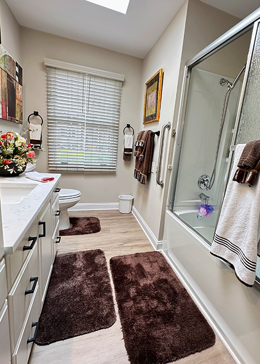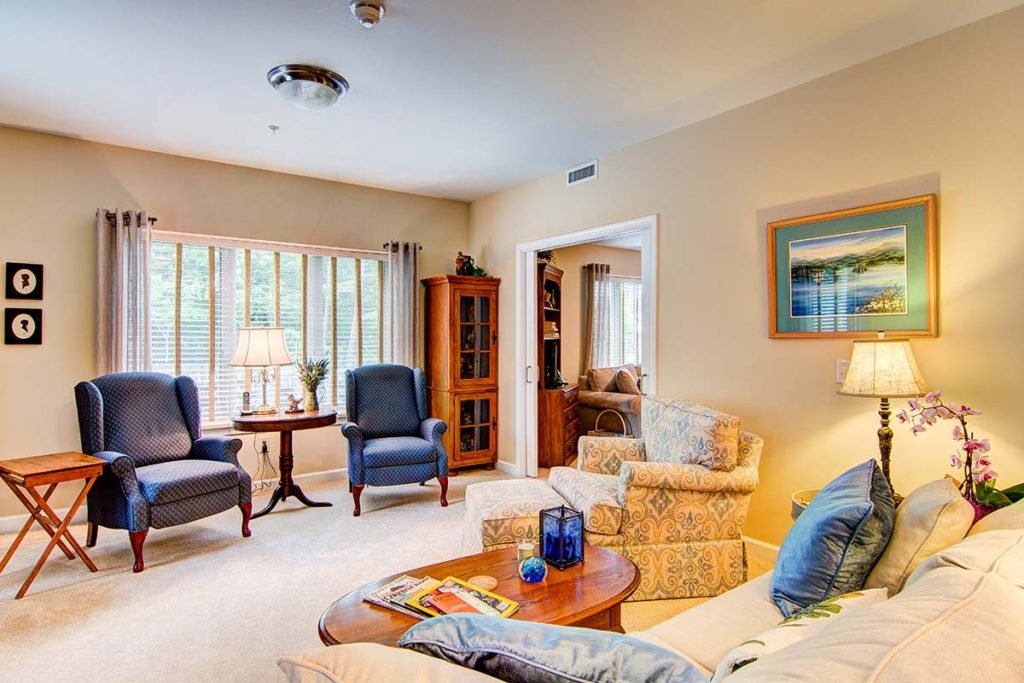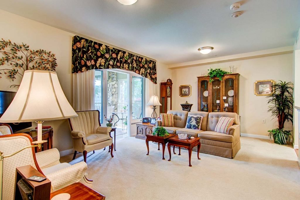 Our large, private assisted living rooms incorporate a living area, bathroom with shower, and walk-in closet within a thoughtfully-designed floor plan that provides utility with lots of natural light.