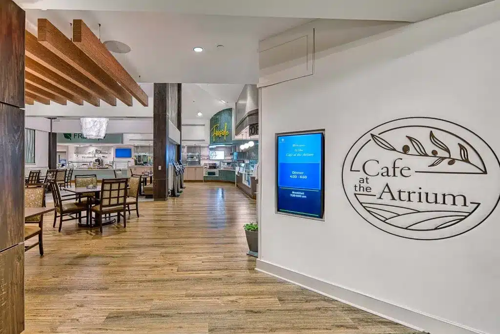 On the Medford Campus is the Community Building, the 79,145-square foot centerpiece of the community that is home to a number of services and activities. Here, you will find dining options, a 310-seat theater, a thrift shop for the basics, and even a wood and metalworking shop.