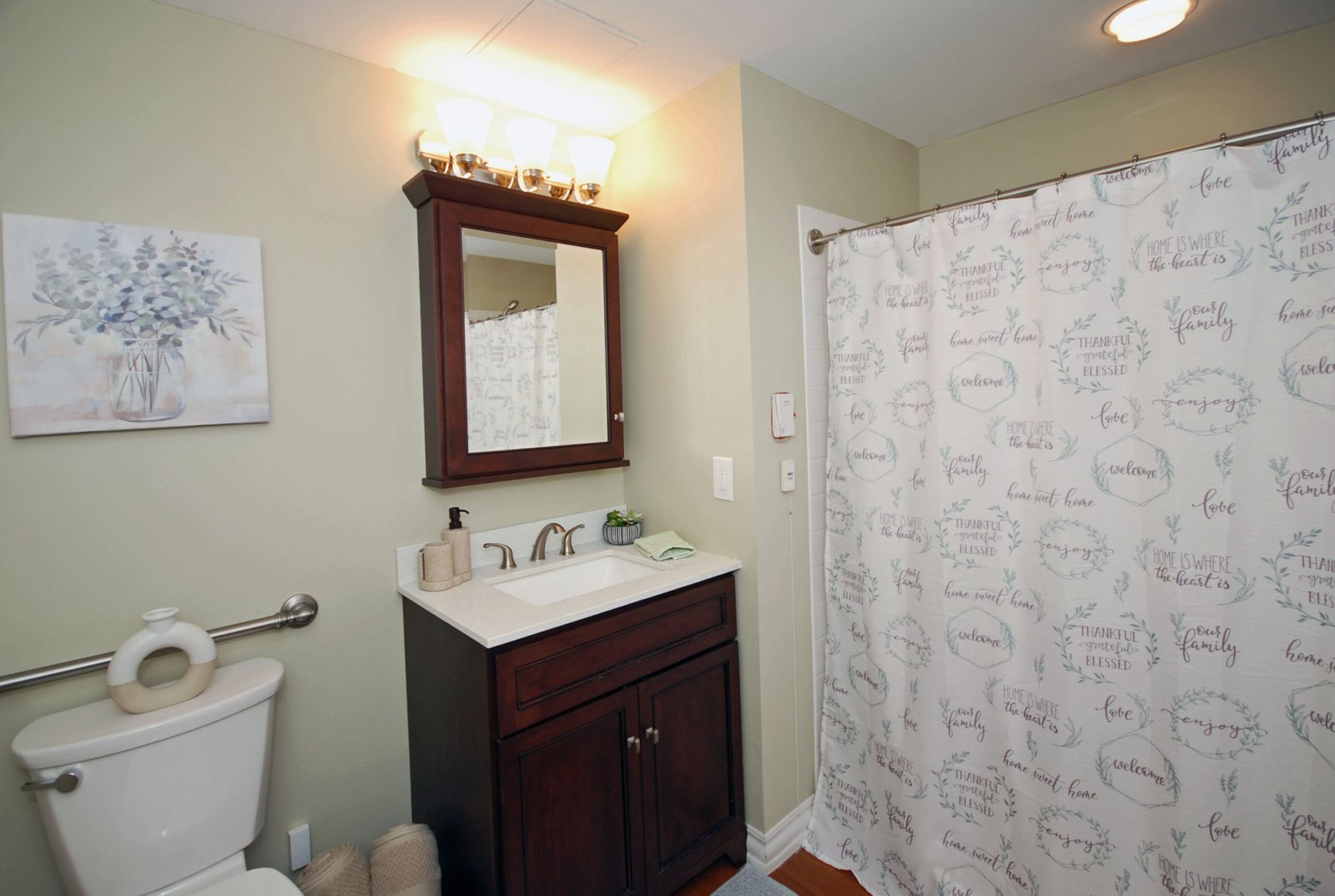 - A well-lit, contemporary bathroom with a large walk-in shower, assist bars, and a vanity/mirror