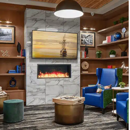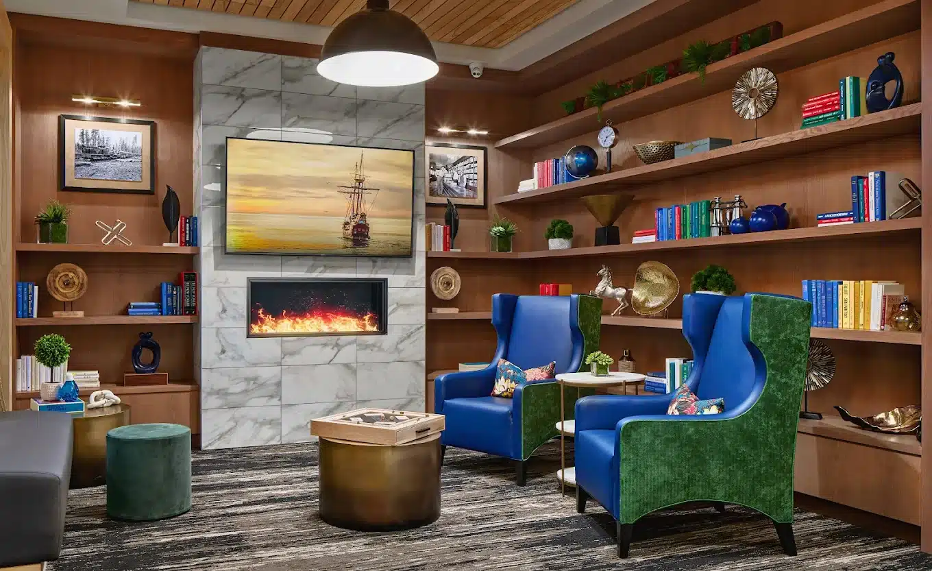 Enjoy the indoor saltwater pool, fire pit courtyard, garden beds, and cozy library nooks.
