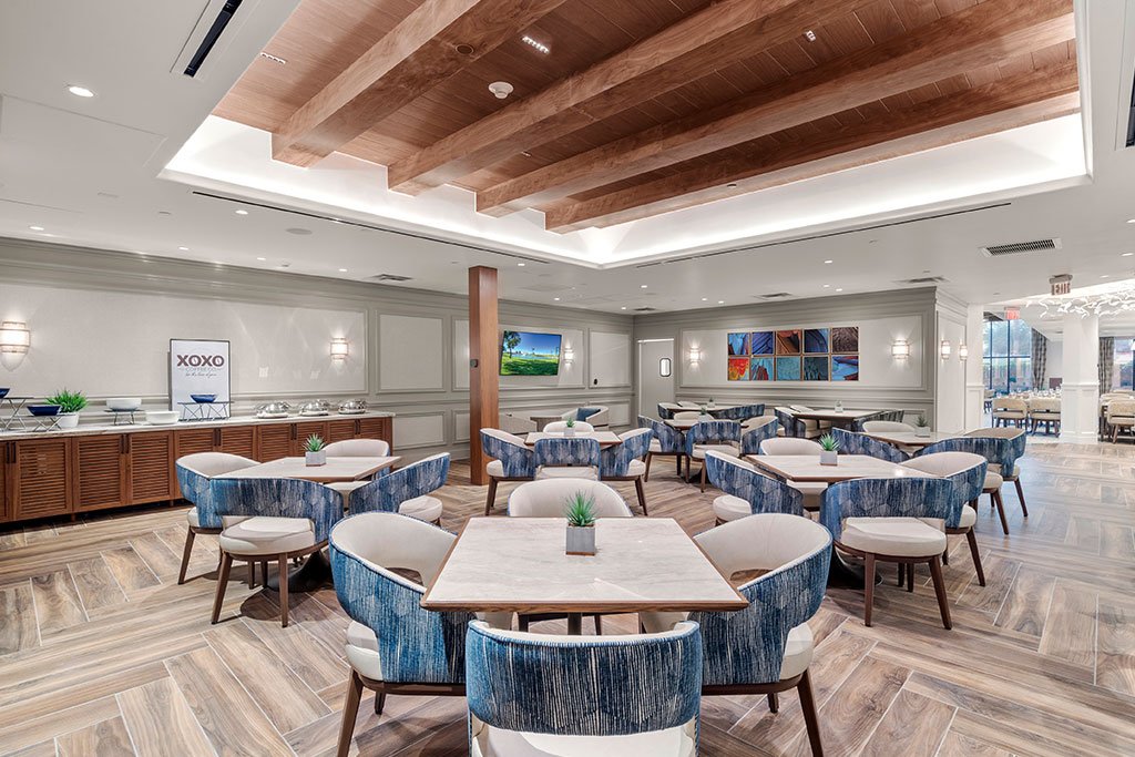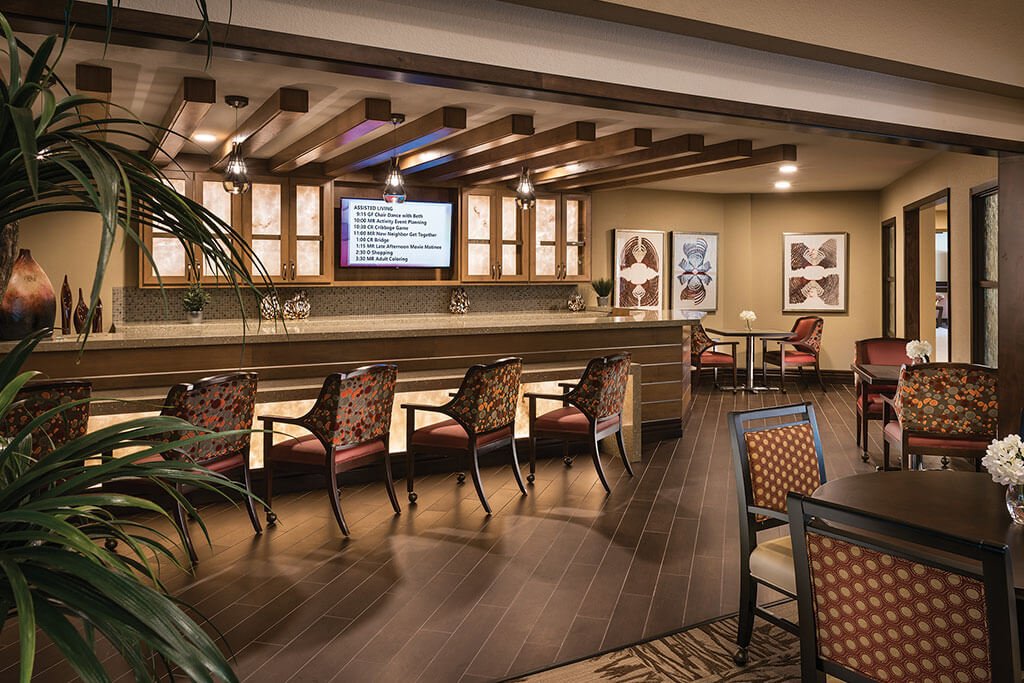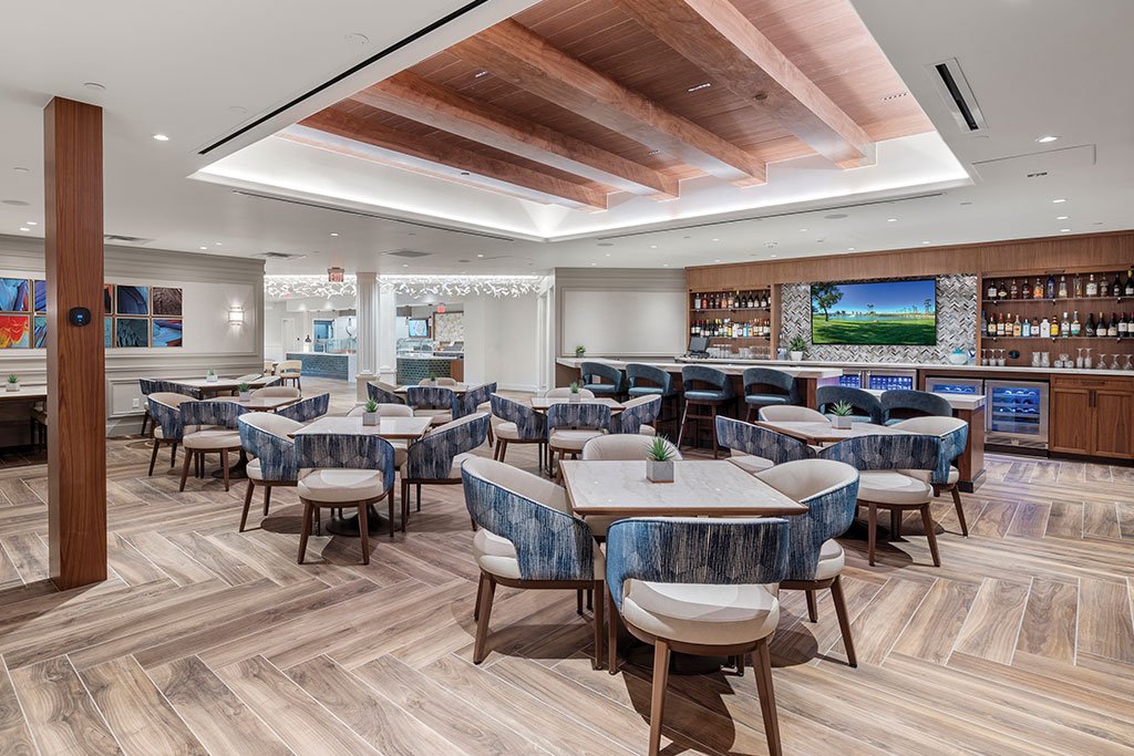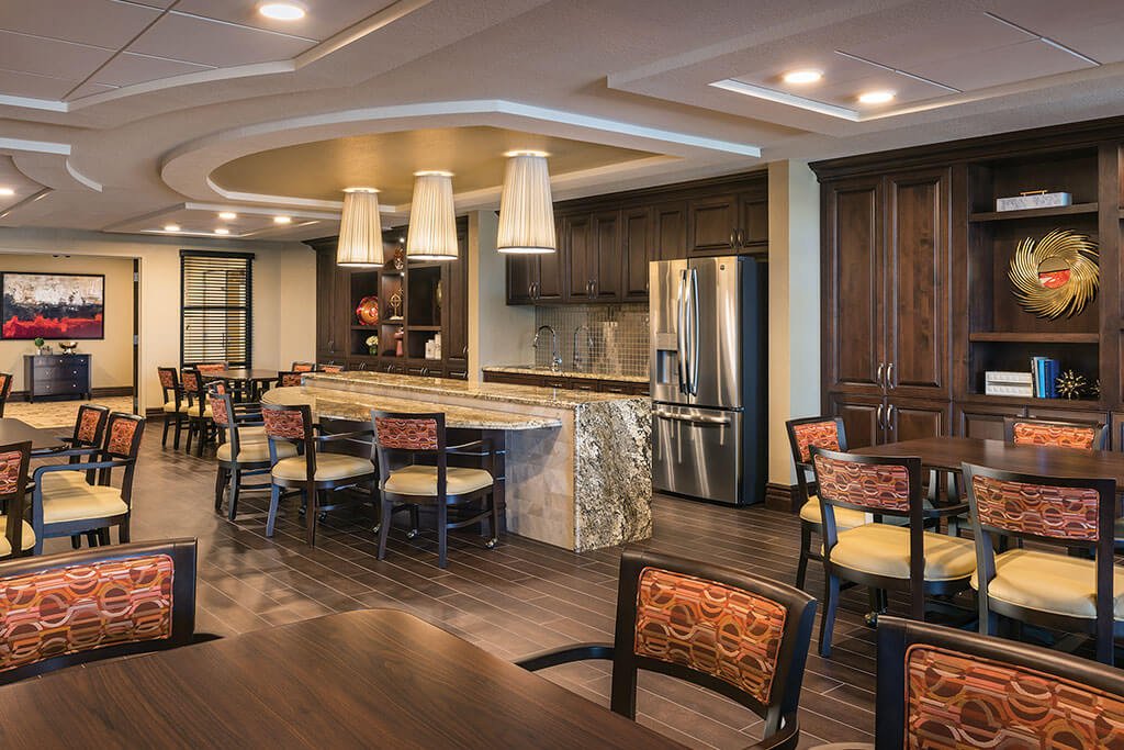 The Nest dining room offers an elevated dining experience where residents can share a meal with family and friends while indulging in delicious cuisine. - “R” Bar