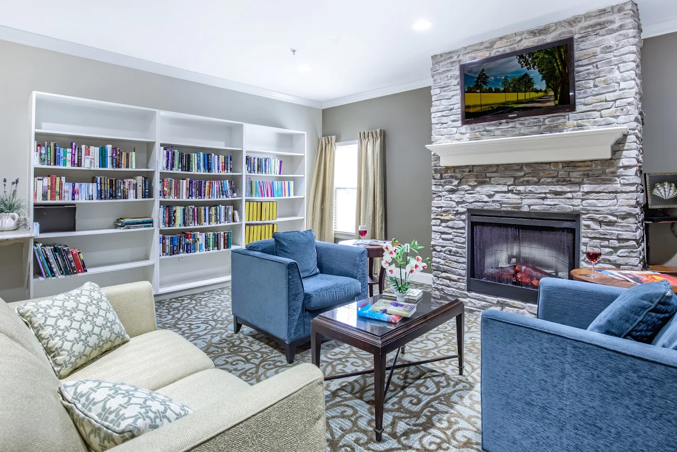 • Resident living room with cozy fireplace